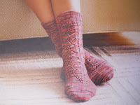 These socks were specifically designed to use wildly variegated or stripey sock yarns. The arrangement of yarn overs and decreases breaks the surface of the fabric into chunks which can tilt and rotate (like tectonic plates). This lets the rows, and the stripes of color contained therein, swoop and bend. I made two versions of this pattern.